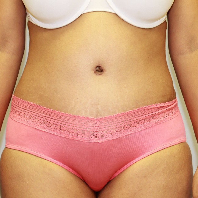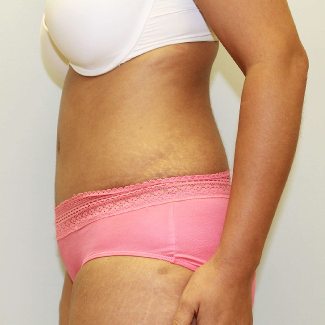 Her results show flattening of the abdomen and a trimmer figure. Abdominoplasty addresses loose skin, excess fat, and diastasis rectus (separation of the muscles). Incisions are planned so that low-cut jeans and two-piece bathing suits cover them.