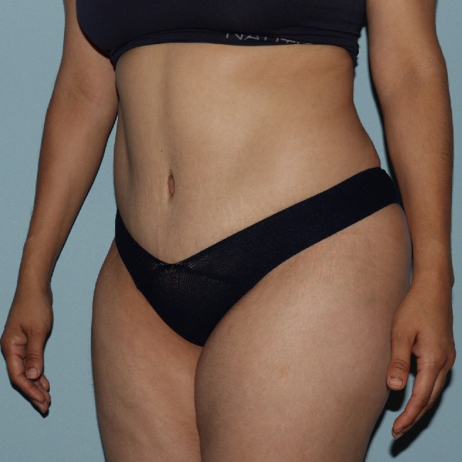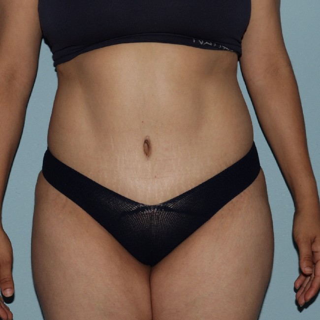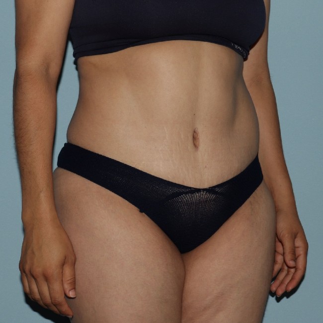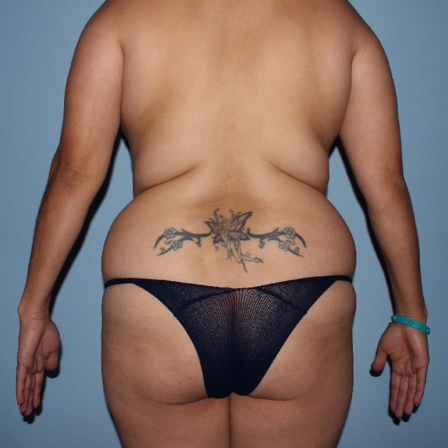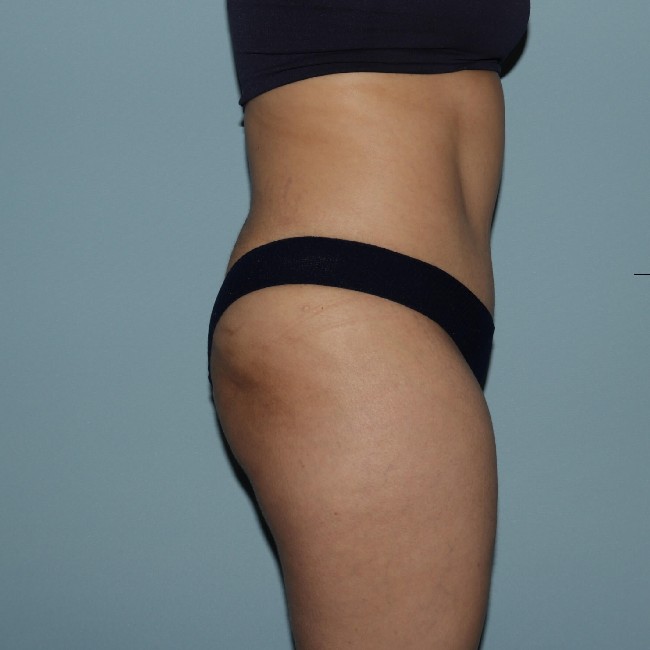 She underwent 360° liposuction with abdominoplasty and limited fat transfer to the buttocks. She had a few other areas of fat deposits in the bra roll and pubic area, and had some additional liposuction about 3 months later, which was transferred to the buttocks. This was a much lesser procedure. Sometimes it can be done with sedation under local anaesthesia. Although liposuction can be combined with abdominoplasty, there are limitations in terms of safety and overall outcome. Concerns about the blood supply to the healing abdominal flap have to be taken into consideration. Recovery from this surgery is facilitated by the use of Exparel, which reduces pain postop.