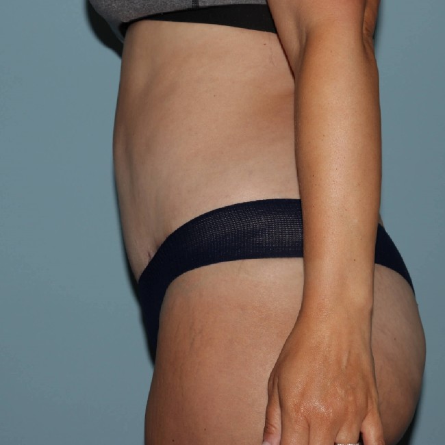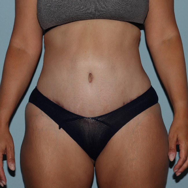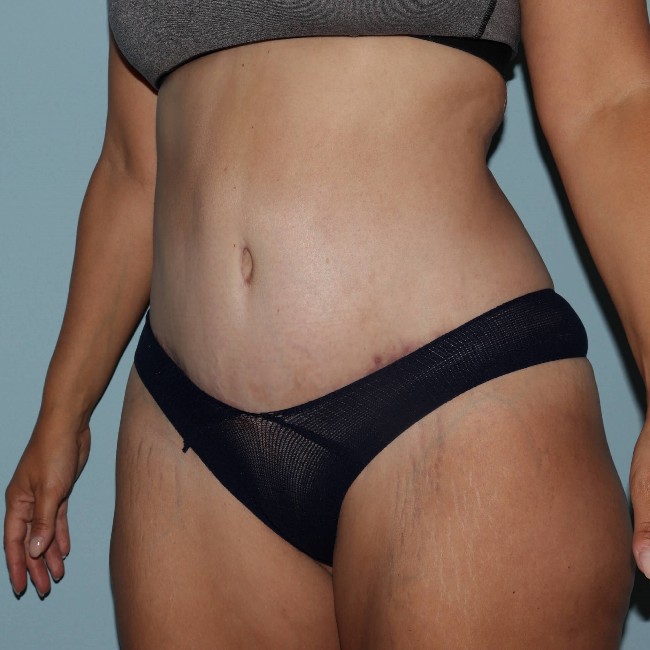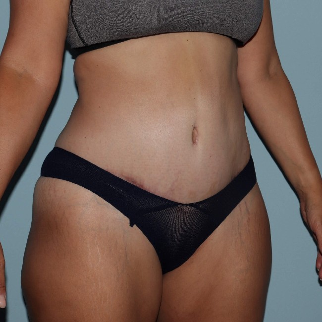 She underwent an abdominoplasty with liposuction of the flanks and lateral thigh. The entire C-section scar was removed, and although she has a longer scar from the abdominoplasty, it is smoother and not indented, and she has much better contours.