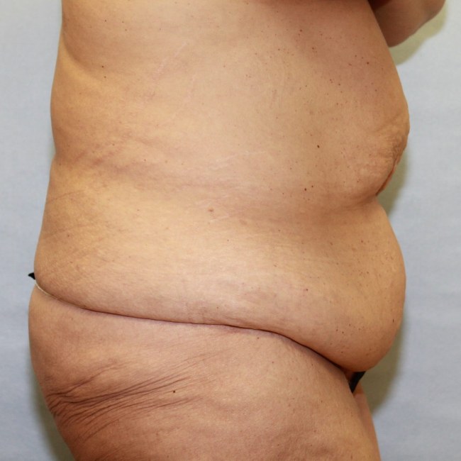 This 45-year-old woman had undergone prior abdominal surgery with previous gastric stapling and also previous colon surgery. She did have a midline vertical scar, but did not have appreciable vertical excess that would necessitate a Fleur-de-lis type abdominoplasty.