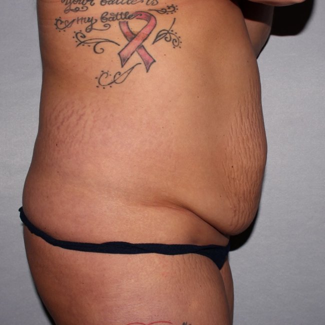 Dr. Lyle evaluated her and recommended weight loss; however, her goals seemed achievable, and she had realistic expectations. She had no other significant health problems, so she underwent a full abdominoplasty with diastasis repair as well as liposuction of the flanks and abdomen. During surgery, she had 5.6 pounds of skin and fat removed from her lower abdomen and nearly 2 lbs. of fat removed via liposuction.